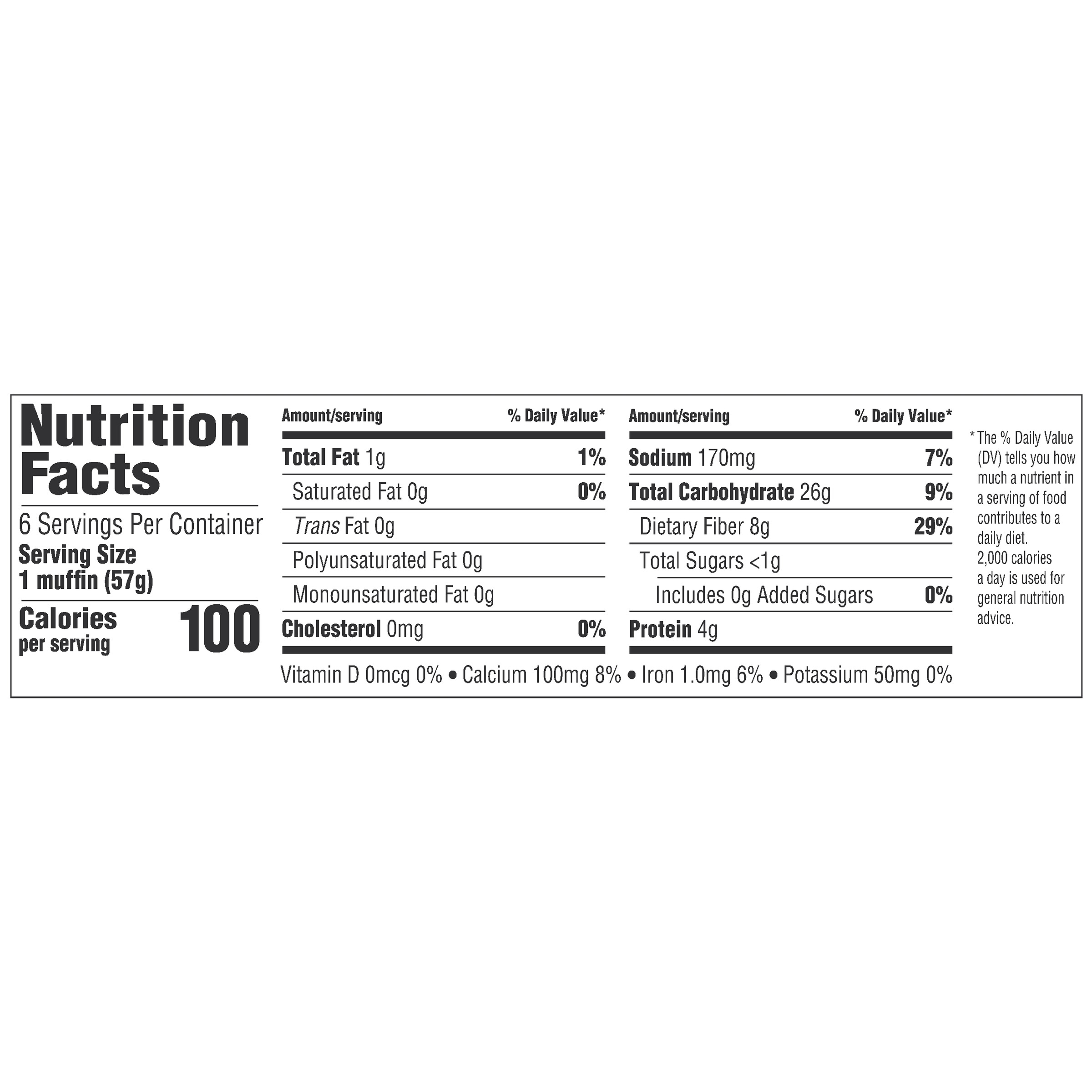 88001 51% Whole Grain, Clean Label, 2oz, Forksplit, English Muffin ... 2%. The % Daily Value (DV) tells you how much a nutrient in a serving of food contributes to a daily diet. 2,000 calories a day is used for general nutrition advice. Item: 88001. Size: 2oz. Pack: 6/12 packs, 72 count. Kosher: K of K. Grams of Whole Grain: 26. Shelf Life: 6 days ambient in package / 15 months frozen. Storage: Frozen at 0 to -10°F.