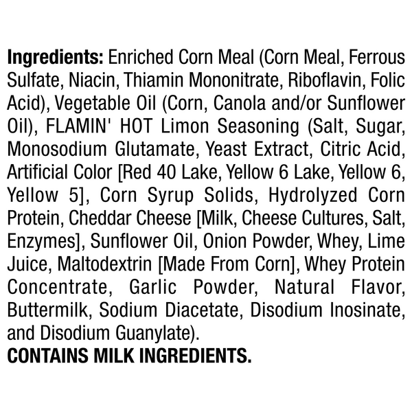 CHEETOS Crunchy Flamin Hot Lim - Online Groceries | Safeway Shop CHEETOS Crunchy Flamin Hot Limon - 3.25 Oz from Safeway. ... Calories from Fat: ... Folic Acid), Vegetable Oil (Corn, Canola, and/or Sunflower Oil), Flamin' Hot Limon Seasoning (Salt, Sugar, Monosodium Glutamate, Yeast Extract, Citric Acid, Artificial Color [Red 40 Lake, Yellow 6 Lake, Yellow 6, Yellow 5], Corn Syrup Solids, Hydrolyzed ...
