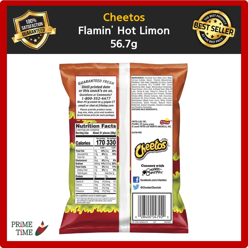 Cheetos Cheese Flavored Snacks, Flamin' Hot Limon: Calories, Nutrition ... Cheetos Cheese Flavored Snacks, Flamin' Hot Limon nutrition grade D plus 160 Calories Per Serving 0 comments No rating 0 followers Explanations Keto: net carbs 12g If you are following a ketogenic diet (keto), you need to restrict your daily carbohydrate intake so that your body enters ketosis. Baked Flamin' Hot Limon Snacks - Nutrition Facts - MyNetDiary There are 140 calories in 34 pieces of Baked Flamin' Hot Limon Snacks by Cheetos from: Carbs 20g, Fat 5g, Protein 2g. Get full nutrition facts for your ...