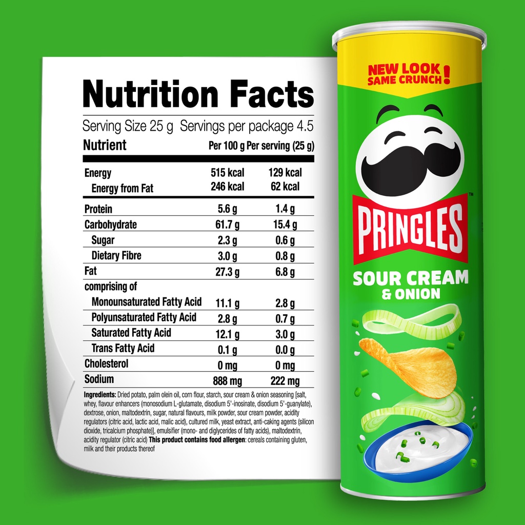 Pringles® Potato Crisps | Pringles® Wavy Ride the flavor wave with Pringles® Wavy. Every wave is popping with delicious flavor and bold crunch that are sure to please Classic Pringles® fans and foodies alike. view all Lighter Side Don't let their name fool you — these Pringles® pack all the flavor of Classic Pringles® into a lightly salted or reduced fat crisp. view all On The Go All About Potato Chips' Nutrition, Including Pringles and Baked Lay's ... You can find out how many Pringles are in a serving by checking the nutrition facts label. One serving of Original Pringles chips is 16 crisps (1 ounce or 28 grams) and contains: One serving of Original Pringles chips is 16 crisps (1 ounce or 28 grams) and contains: Pringles (History, Flavors, Pictures & Commercials) As of 2019, the container tubes for the Pringles appear to continue to label the product as "potato crisps". The machine used to cook Pringles was developed ... This information is for a 5.2oz container of Pringles Original. Ingredients: Dried Potatoes, Vegetable Oil (Corn, Cottonseed High Oleic Soybean, and/or Sunflower Oil), Degerminated ... Pringles Nutrition Facts. Calories, carbs, fat, sodium & more ... Get nutrition information for Pringles items and over 200,000 other foods (including over 3,500 brands). Track calories, carbs, fat, sodium, sugar & 14 other nutrients. Toggle navigation. ... Pringles Reduced Fat Sour Cream & Onion Chips. 16 crisps (28g) Nutrition Facts. 140 calories. Log food: Pringles Honey Mustard Chips. 15 crisps (28g)