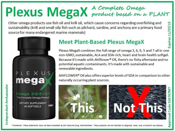 MegaX - beyoutifullyplexus PLEXUS MEGA X® Good for the heart, good for the soul.* Plexus® MegaX is a full spectrum plant-based Omega that delivers the heart-healthy benefits of fish oil, without the unpleasant aftertaste. Omega 3 fatty acids are super healthy and support everything from your heart to your brain and even help manage stress.* Benefits WEIGHT MANAGEMENT