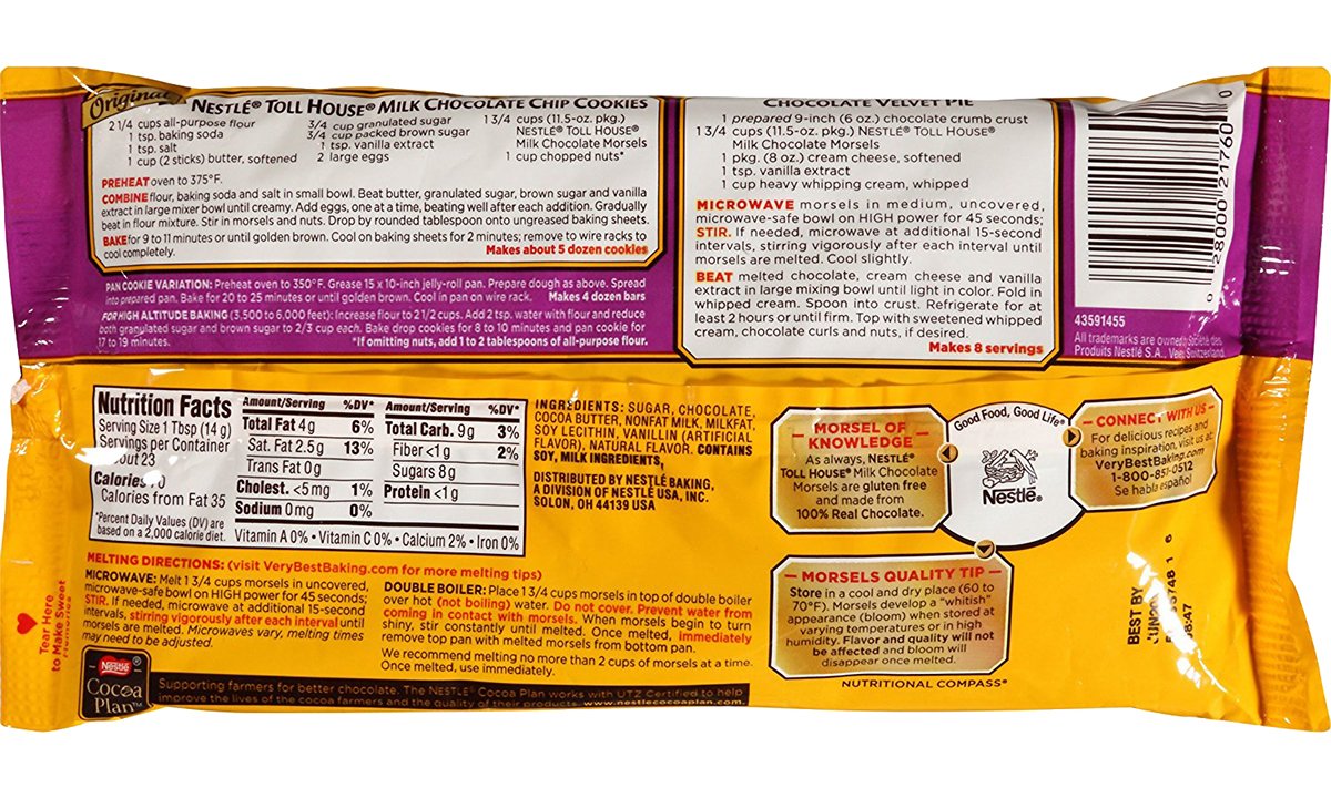 Choclait Chips White - Nestlé - 115g Ingredients, allergens, additives, nutrition facts, labels, origin of ingredients and information on product Choclait Chips White - Nestlé - 115g What are the ingredients in Nestle chocolate chips? Some other fun facts: - Bitter and semi-sweet chocolate chips must contain a minimum of 35% cacao, but most popular chocolate chips available in stores now contain 50-58% cacao. - Extra bittersweet or high-percentage chocolate contains more than the average cacao. The amount is usually listed on the label. What is vegan chocolate chips? Nestle Toll House Milk Chocolate Chips - 11.5oz : Target Highlights. One 11.5 oz bag of Nestle Toll House Milk Chocolate Chips. Nestle Toll House chocolate baking chips deliver sweet flavor to your favorite recipes. Perfect to add to chocolate cookies, brownies or pancakes along with other dessert recipes. Gluten free milk chocolate morsels are made without artificial flavors, colors or preservatives. Nutrition Label - Allergen Inside Nestle Toll House Semi-Sweet Morsels For Nestle Toll House Chocolate Chip Cookies, in a larger sizeLarger bag for more baking occasions, UPC Code 028000303976 Manufactured by Dreyer's Grand Ice Cream Inc. ... Nutrition Label. Nutrition Facts. Serving Size 1.00 tbsp. Amount Per Serving. Calories 70 Calories from Fat 35 % Daily Value* Total Fat ...