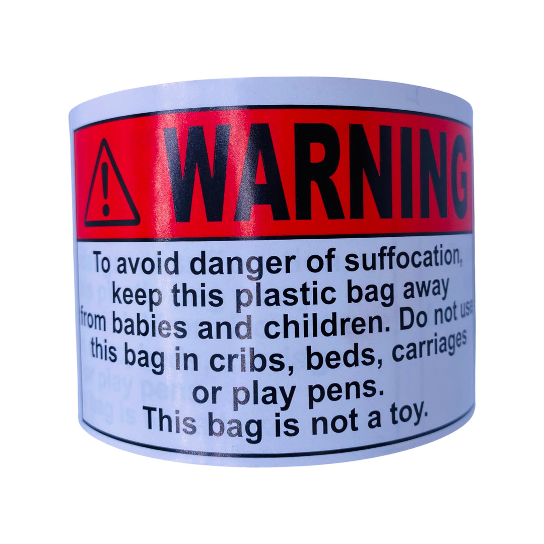 Bag Suffocation Warning: What Importers & Amazon Sellers Must Know Warning print size Is bag suffocation warnings mandatory when selling on Amazon? All poly bags with a minimum flat opening length of 5-inch (12.7 cm) must have a printed bag suffocation warning label. Further, Amazons requirements also cover the following: Bag warning label text print size Bag thickness Barcodes
