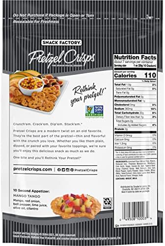 Snackers Classic Hummus with Pretzels - Sabra Pretzels (Enriched Wheat Flour [Wheat Flour, Niacin, Reduced Iron, Thiamine Mononitrate, Riboflavin, Folic Acid], Salt, Corn Oil, Sodium Bicarbonate, Malt Syrup). CONTAINS: WHEAT INGREDIENTS. Vegetarian Nutrition Information We know it's been tough to find some Sabra products in store lately! What Are Pretzels, and Are They Healthy? As you can see in the table above, one soft pretzel could contain 2.5 times more calories and carbs than one serving of hard pretzels. A soft pretzel also has twice as much salt per serving. Still,... Snack Factory Pretzel Crisps, Original, Party Size, 14 Oz - Walmart.com Nutrition facts. Refer to the product label for full dietary information, which may be available as an alternative product image. 14.0 Servings Per Container. ... Our Pretzel Crisps give you the best part of pretzels without the doughy center, for a satisfying, hearty crunch in a sturdy shape that's dippable, toppable, and deliciously snackable ...