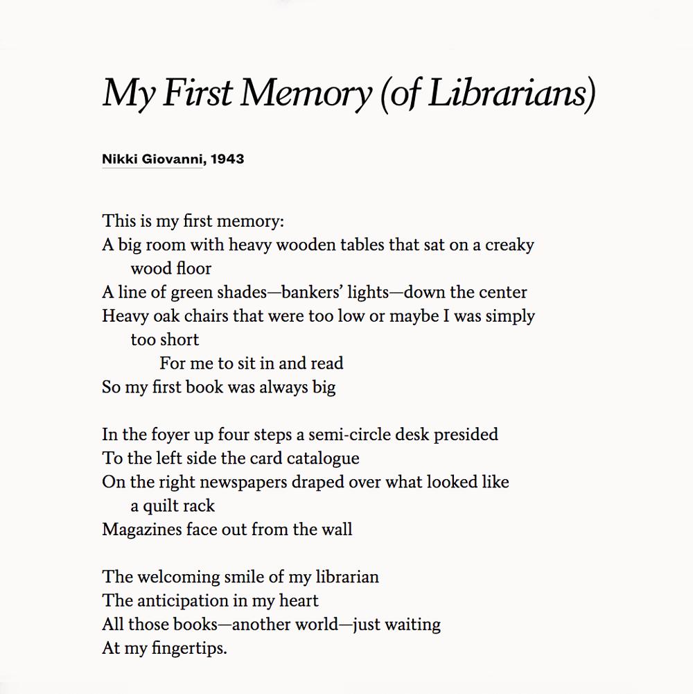 Ego Tripping (there may be a reason why) by Nikki Giovanni - Poems … WebThis is my first memory: A big room with heavy wooden tables that sat on a creaky wood floor A line of green shades—bankers’ lights—down the center Heavy oak chairs that were too low or maybe I was simply too short For me to sit in and read So my first book was always big In the foyer up four steps a semi-circle desk presided To the left side the card …