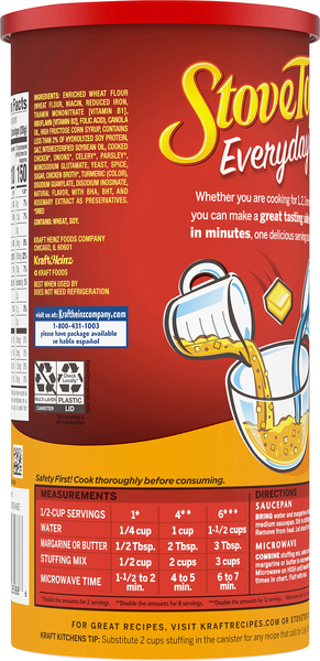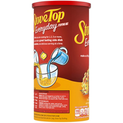 Turn Stove Top Stuffing Mix Into Pan Dressing to Die For directions. Open stuffing mix boxes and empty into a 9 x 13 baking dish. Add onion and celery. In a separate bowl beat the eggs and add both soups. Add to stuffing mix and stir completely. Begin adding chicken broth slowly. Wait a few minutes in between pours for the mix to soak it up. When you are done you want very wet to just about soupy in ... Kraft Stove Top Everyday Stuffing Mix For Chicken - Directions for Me Saucepan: Bring water and margarine or butter to boil in medium saucepan. Stir in stuffing mix; cover. Remove from heat. Let stand 5 min. Fluff with fork. Microwave directions: Combine stuffing mix, water and margarine or butter, cut into pieces, in microwaveable bowl; cover. Microwave on high until heated through, using times in chart below.