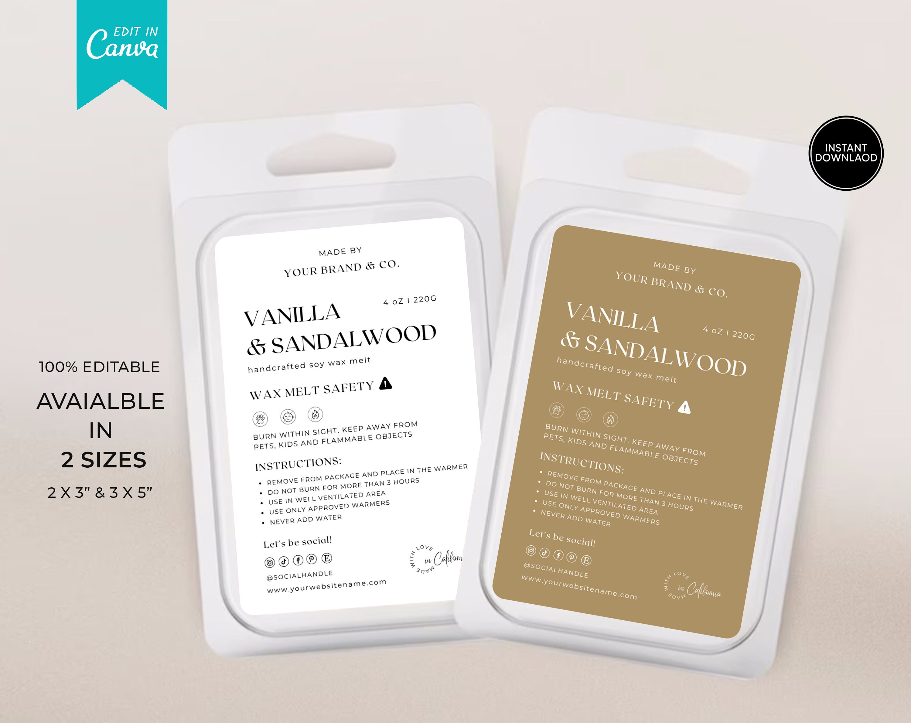 Wax Melt Label - Etsy 3 x SEASONAL Editable Wax Melt Label, Christmas Candle Label, Custom Product Label, Wax Melt Template, Printable Wax Melt Labels, CANVA. labelmwah. (552) $8.00. Wax Melts Care Card Canva Template, Printable Wax Melts Care Instructions, Editable Small Business Wax Melt Care Cards. DTP-030. DigitalTemplatePaper. (2,703) 15 Wax Melt Ideas | candle quotes, candle labels, candle business Dec 26, 2020 - Explore Debra Rosales's board "Wax Melt Ideas" on Pinterest. See more ideas about candle quotes, candle labels, candle business. Wax Melt Labels - Etsy Wax Melts Labels Template, Minimalist Label Design, Customizable Wax Melt Label, 2x3 and 3x5, Wax Clamshell Sticker, Instant Access, M-002 DiyMyDesignStore (2,335) $6.95 Editable Neon Wax Melts Label Template (2 Sizes), Printable Soy Wax Melt Tarts Sticker, DIY Modern Colorful Wax Tarts Label Design Template BCNLabels (617) $8.14 Custom Wax Melt Labels, Get Instant Pricing | OnlineLabels® Get wax melt labels that impress when you let us print them for you. Our high-quality printing processes produce retail-quality labels with colors that pop. With labels available on sheets and rolls, enjoy flexibility with your order size. Every order includes: Low Minimum Order Sizes Discount on Design Variations 2-3 Business Day Turnaround Time
