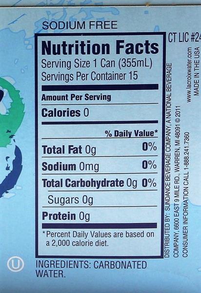 LaCroix Sparkling Water, Orange: Calories, Nutrition ... - Fooducate Nutrition Serving Size: 1 can Amount per Serving My Daily Value Calories 0 Kcal 0% Total Fat 0 g 0% Saturated Fat 0 g 0% Trans Fat 0 g 0% Sodium 0 mg 0% Total Carbohydrate 0 g 0% Dietary Fiber 0 g 0% Sugars 0 g 0% Added Sugars 0 g 0% Protein 0 g 0% Ingredients Carbonated Water, Natural Flavor. Elizabeth2476 Oct 17 2013 this stuff is No rating