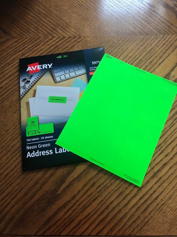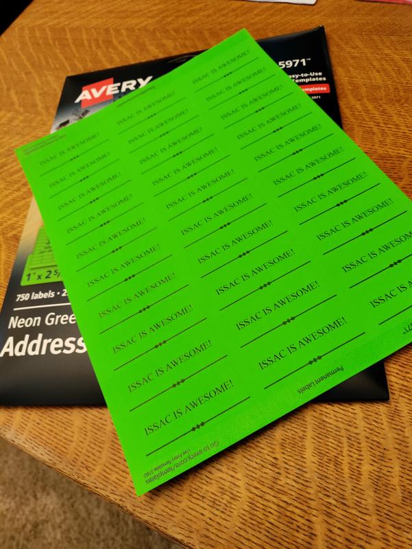 Avery 5971 High-Visibility Rectangular Laser Labels, Neon Green, 2 5/8 ... Avery 5971 High-Visibility Rectangular Laser Labels, Neon Green, 2 5/8" x 1", Sheet of 30 Labels, Pack of 25 Sheets 05971 Price $32.11 /package Web price: $35.44/package Checking Live Inventory... Qty. Unit Add To Cart Also available in