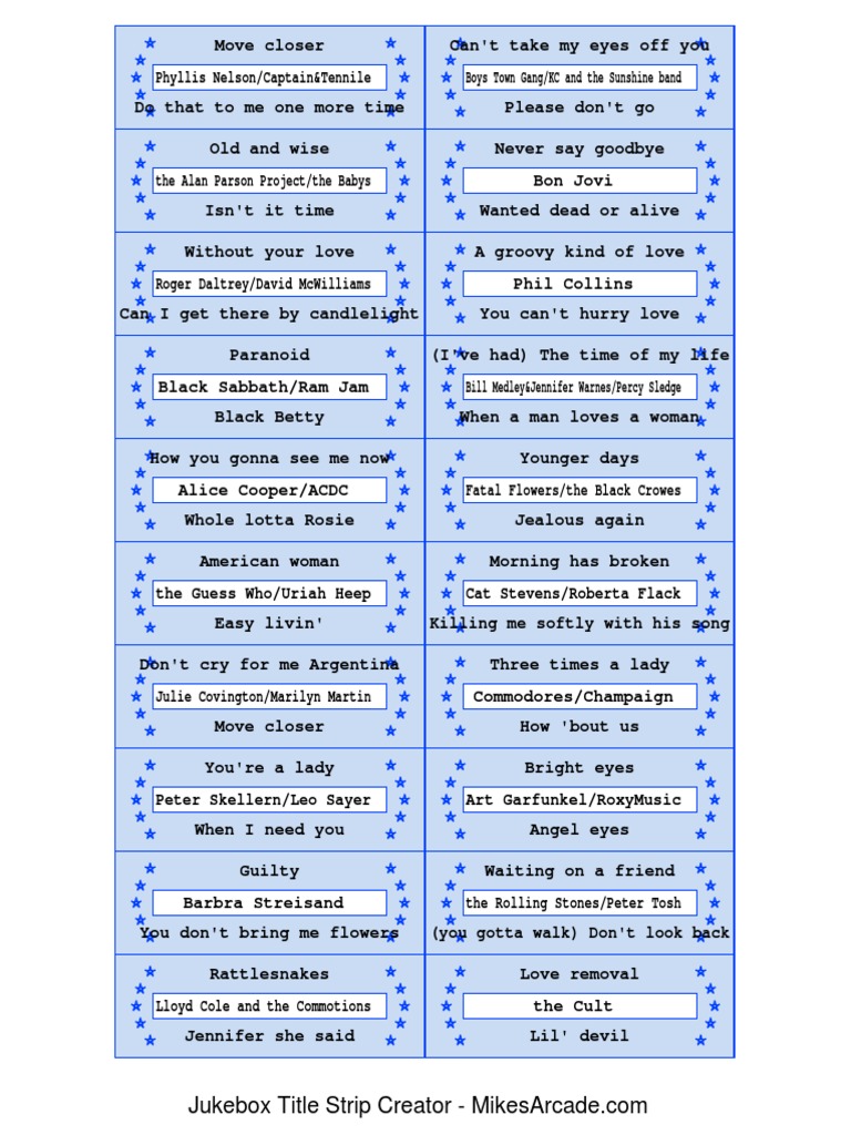 Jukebox Create-A-Label | Free Title Strip Software The easiest way to create Title Strips for your Jukebox. This new version gives you total control over the layout and design of a Jukebox Label. About Us Download Free! Jukebox Title Strip Creator - MikesArcade.com Jukebox Title Strip Creator - MikesArcade.com. Title: Jukebox Title Strip Creator Author: MikesArcade.com Created Date: 4/25/2023 4:24:22 AM ... Jukebox Title Strip Creator for 45rpm records Jukebox Title Strip Creator for 45rpm records Jukebox Title Strip Creator 45 & 33 1/3 rpm records Instructions: Enter information you want printed. If A side artist is the same as the B side artist, leave one blank. If you don't want publisher information printed, don't enter it. Click 'Create PDF' and the PDF will open in the window. Jukebox Create-A-Label | Jukestrips.com JukeBox Create-A-Label v3.0 has the ability to print 45 RPM or 78 RPM title strips for your jukebox. There are many different title strip designs to choose from. You can use different title strip designs to make it easy to find a specific artist or genre of music on the jukebox (by color or by theme).