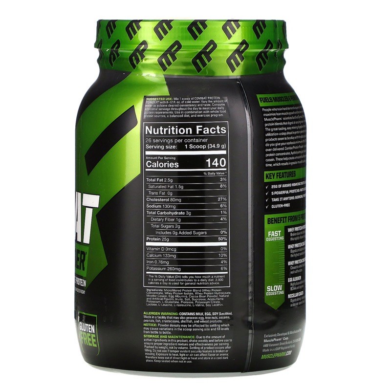 My MusclePharm Combat Protein Powder Review - heydayDo.com Combat protein nutrition facts * 71% protein per serving by weight * Carbs, fat, & sugar per serving higher than pure protein powders, but lower than the really processed junk out there * Same goes for the sodium level Combat protein amino acid profile